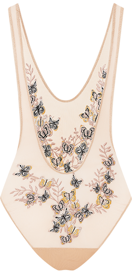 Nude w/ Gold Embroidery $295An effortless exposé. This one piece mesh swimsuit is subtly sexy with sleek lines that plunge at the neckline, and arc for a low open back and open sides. Produced and embroidered in New York City.