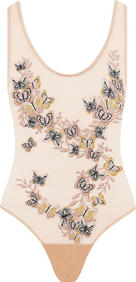 The creative heartbeat of our collection comes to life with our mesh; where delicately embroidered butterflies flourish across the fabric like paint on a canvas. Custom designed in New York City, the transparency of the mesh blurs the lines between skin, fabric, and motif and directly implicates the body into the art of the design. The embroidery is carefully organized on the suit to ensure full coverage while still maintaining the integrity of each design.