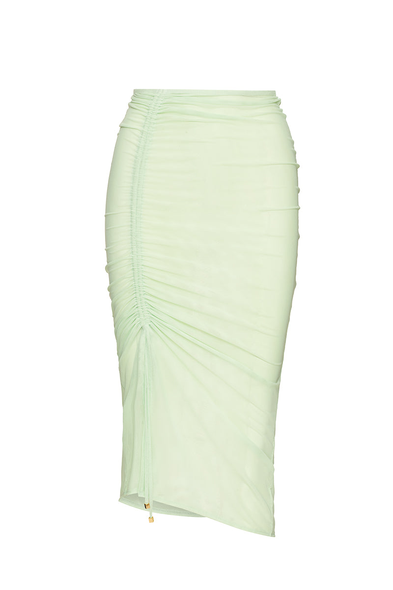 Green Mesh $195Illusion mesh gathered skirt. Made in a slim fit with gathering along the front for a flattering fit. Double layer mesh fabric with nice stretch and just enough coverage. Adjustable side ties allow you to raise or lower the length. Ties are finished with gold ends for a luxe finish. Designed and produced in New York City.