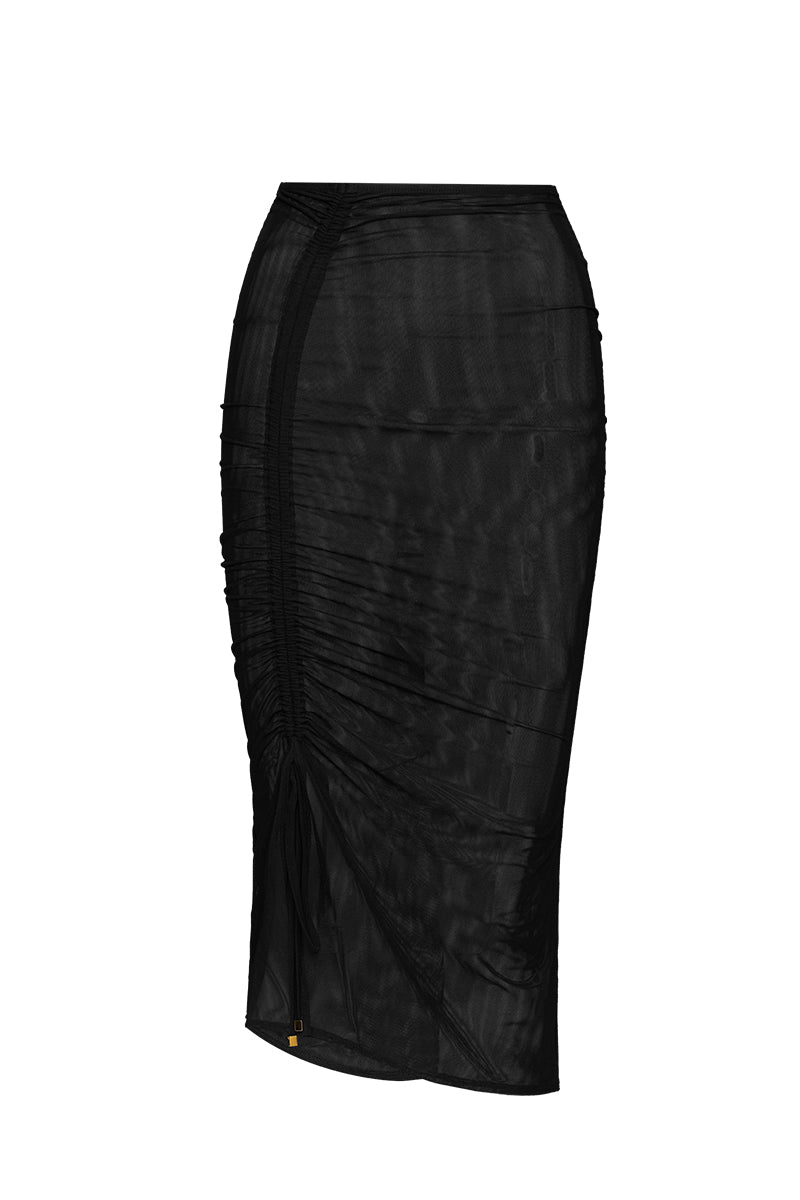 Black Mesh $195Illusion mesh gathered skirt. Made in a slim fit with gathering along the front for a flattering fit. Double layer mesh fabric with nice stretch and just enough coverage. Adjustable side ties allow you to raise or lower the length. Ties are finished with gold ends for a luxe finish. Designed and produced in New York City.