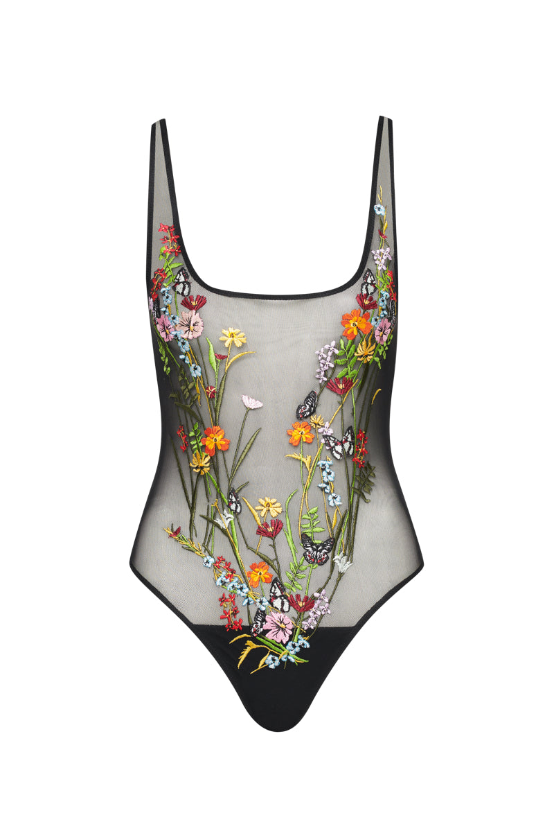 Butterfly Embroidery Black $395Aura one piece in butterfly embroidered mesh. Made with a square neck, slim fit, low cut back and embroidery to cover all the right places. Lined bottom. Designed and produced in New York City.