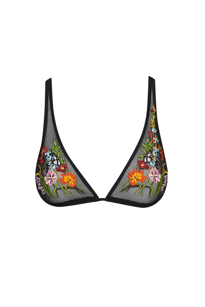 Butterfly Embroidery Black $185Iris triangle bikini top in butterfly embroidered mesh. Our newest triangle top with adjustable over-the-shoulder straps. Embroidery provides full coverage. Gold tie ends for a luxe finish. Designed and produced in New York City.