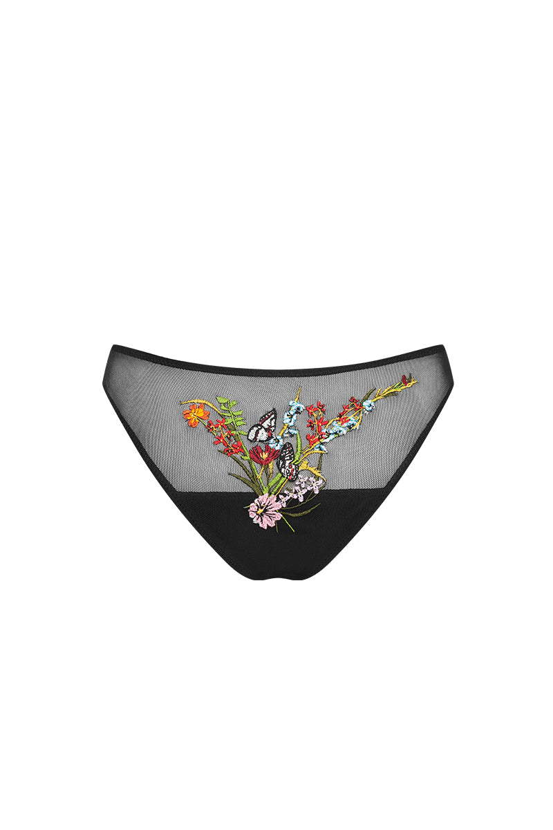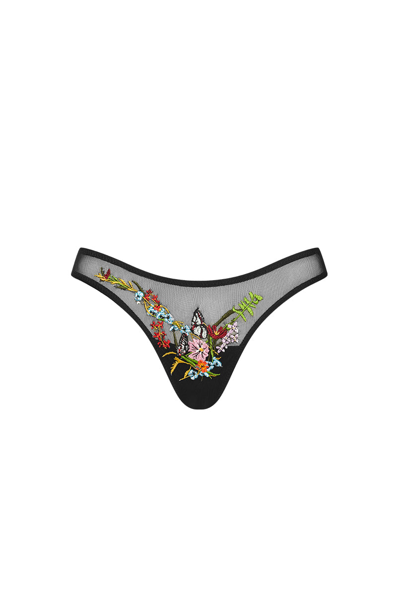 Butterfly Embroidery Black $175Tulum high cut bikini bottom. A high cut bottom to give your sun-kissed legs a long, lean look. Embroidery provides full coverage. Designed and produced in New York City.