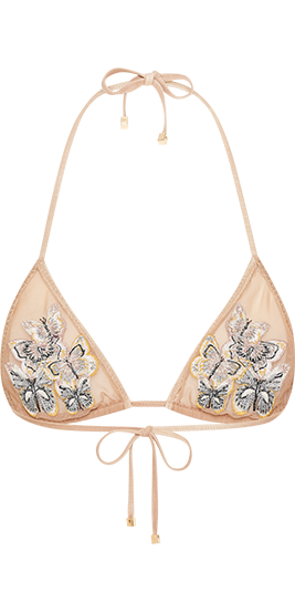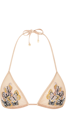 Nude w/ Gold Embroidery $150Sweet simplicity. The timeless Monarch triangle string bikini top ties at the neck with thin adjustable ties at the back. Produced and embroidered in New York City.