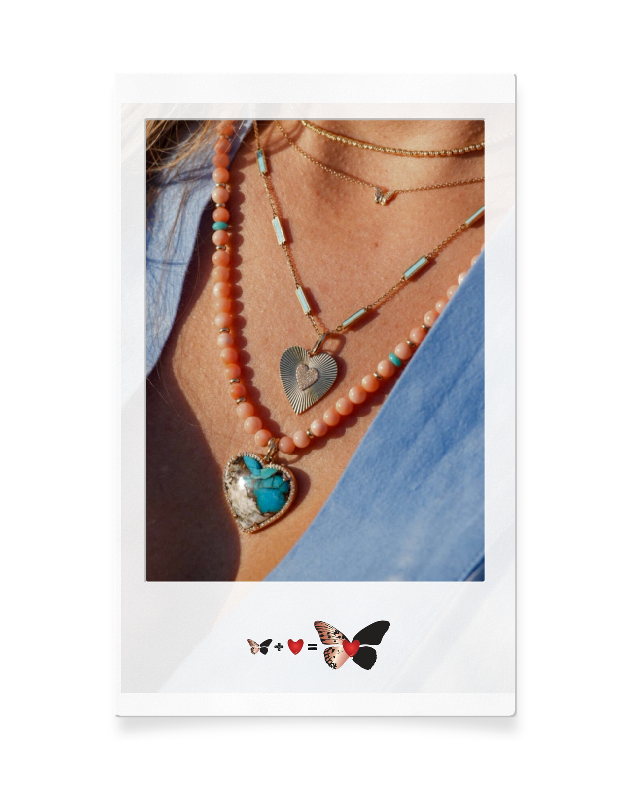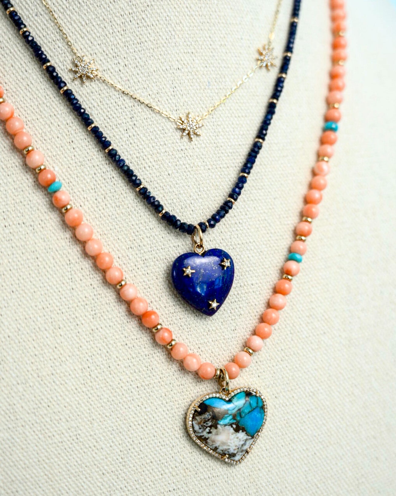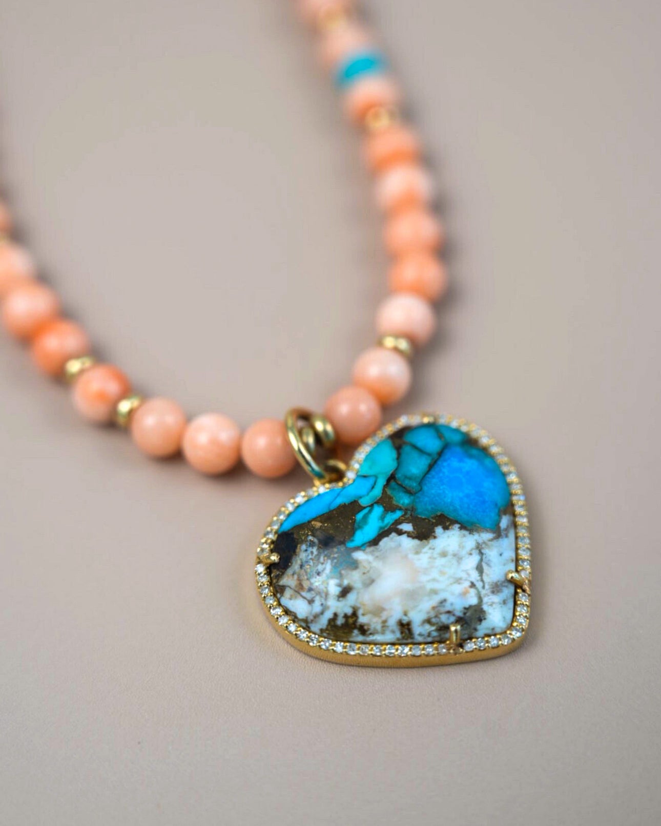 $3,740A beautifully hand-beaded statement piece featuring soft angel skin coral accented with natural turquoise and 14K yellow gold spacer beads. At the center, a stunning turquoise heart pendant framed with diamonds creates a romantic focal point that feels both playful and refined.