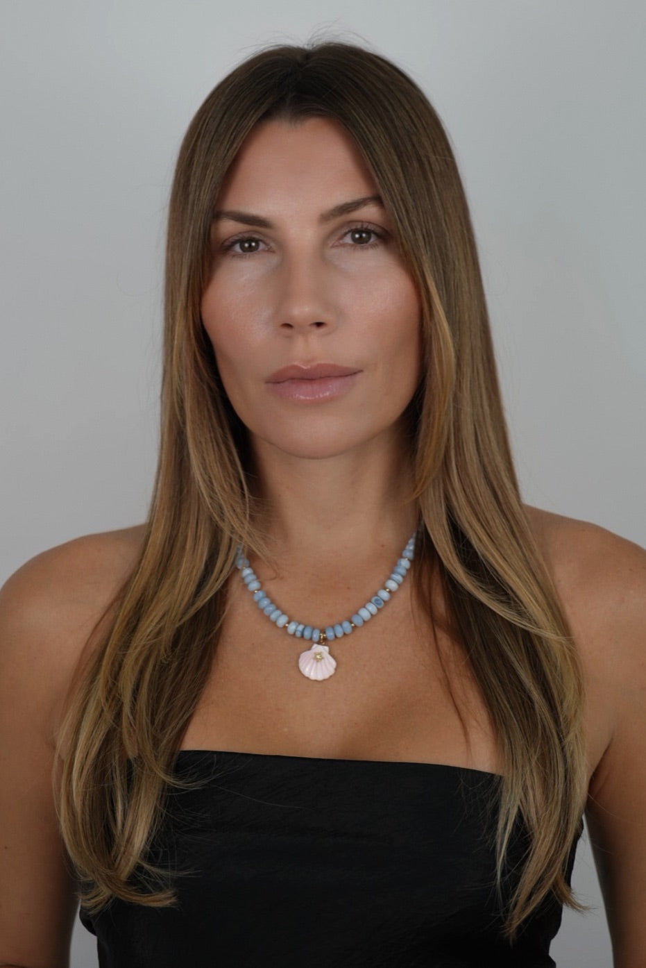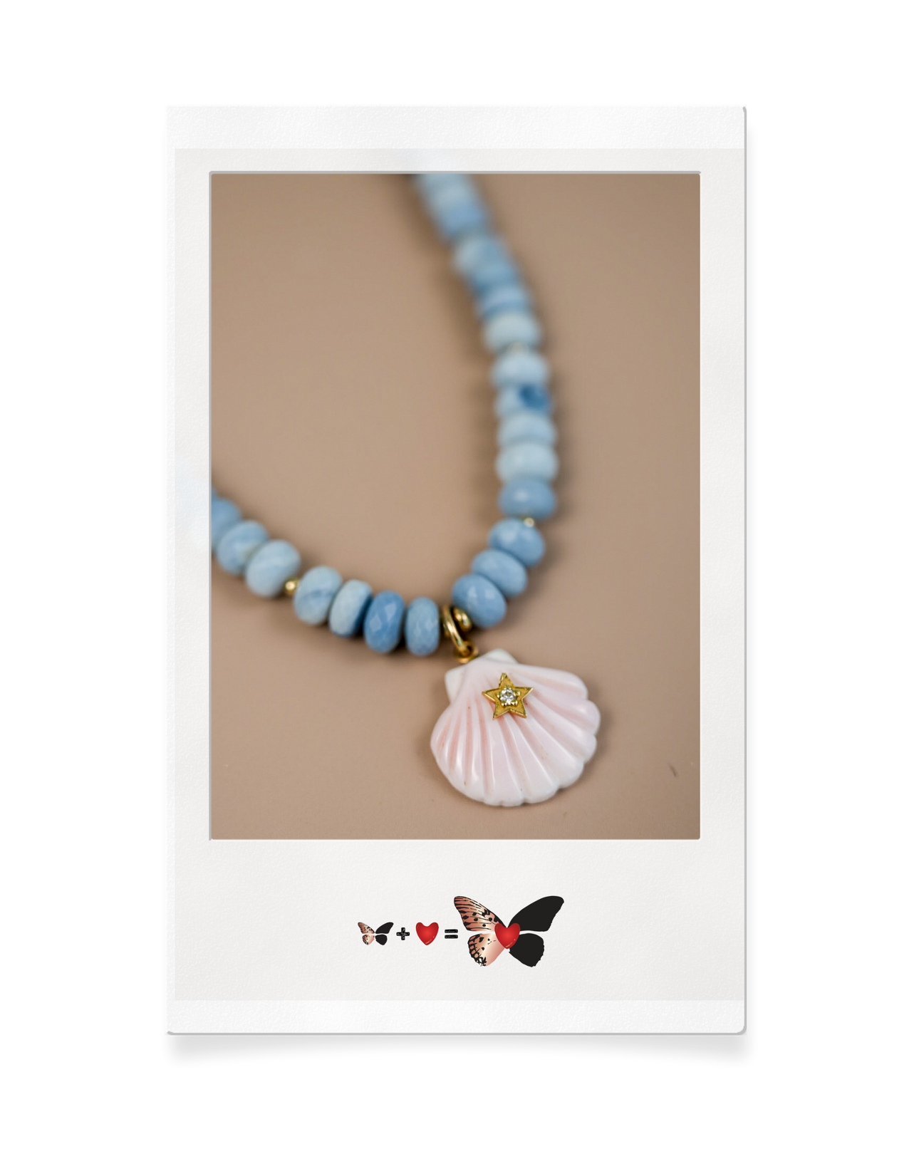 The cool blue opal tones paired with the natural shell pendant create a serene, ocean-inspired palette that feels both unique and timeless. Designed to stand out as a statement piece or layer effortlessly with other fine jewelry.