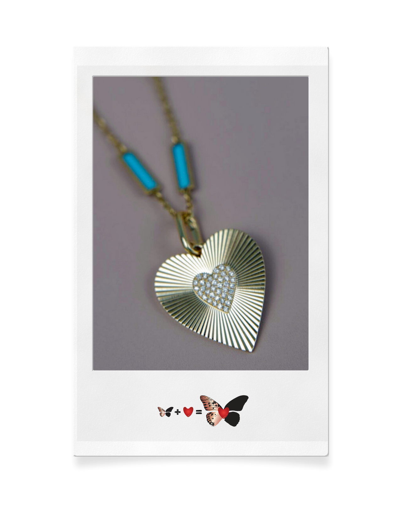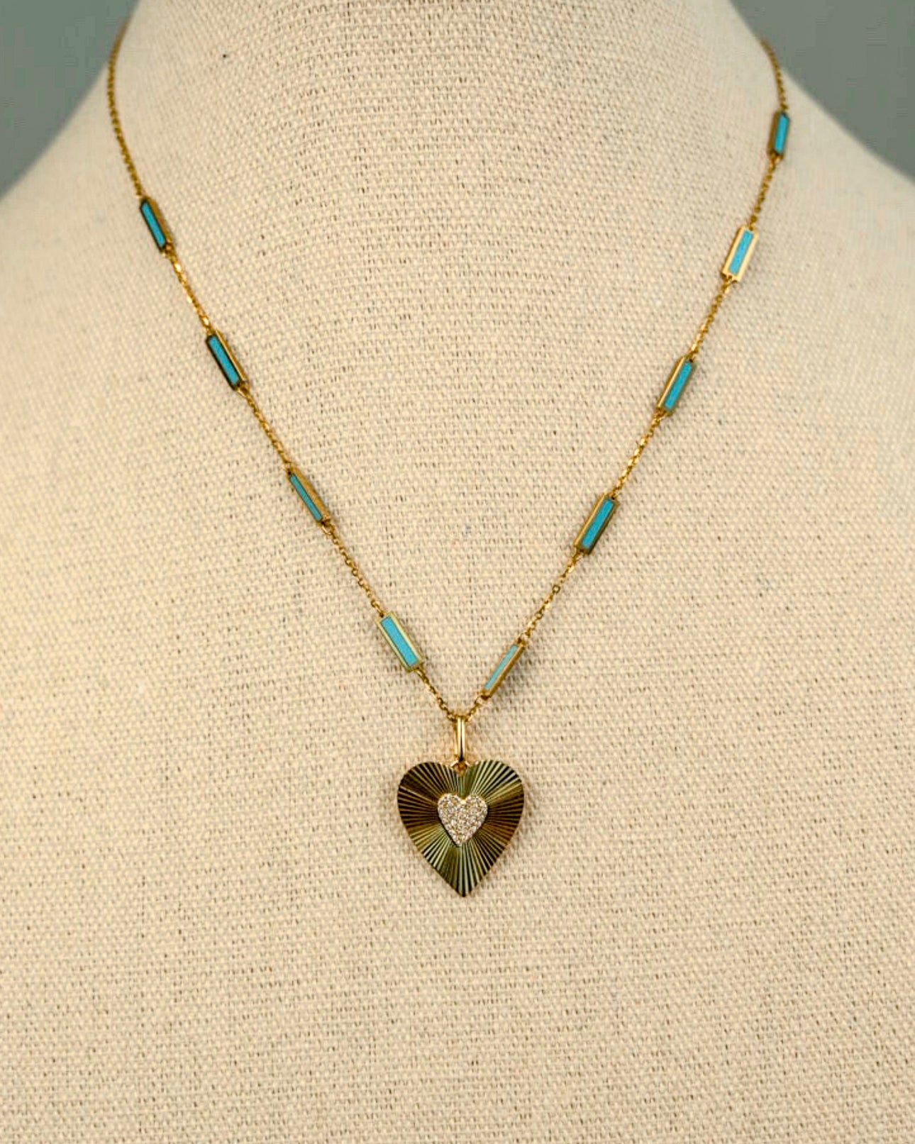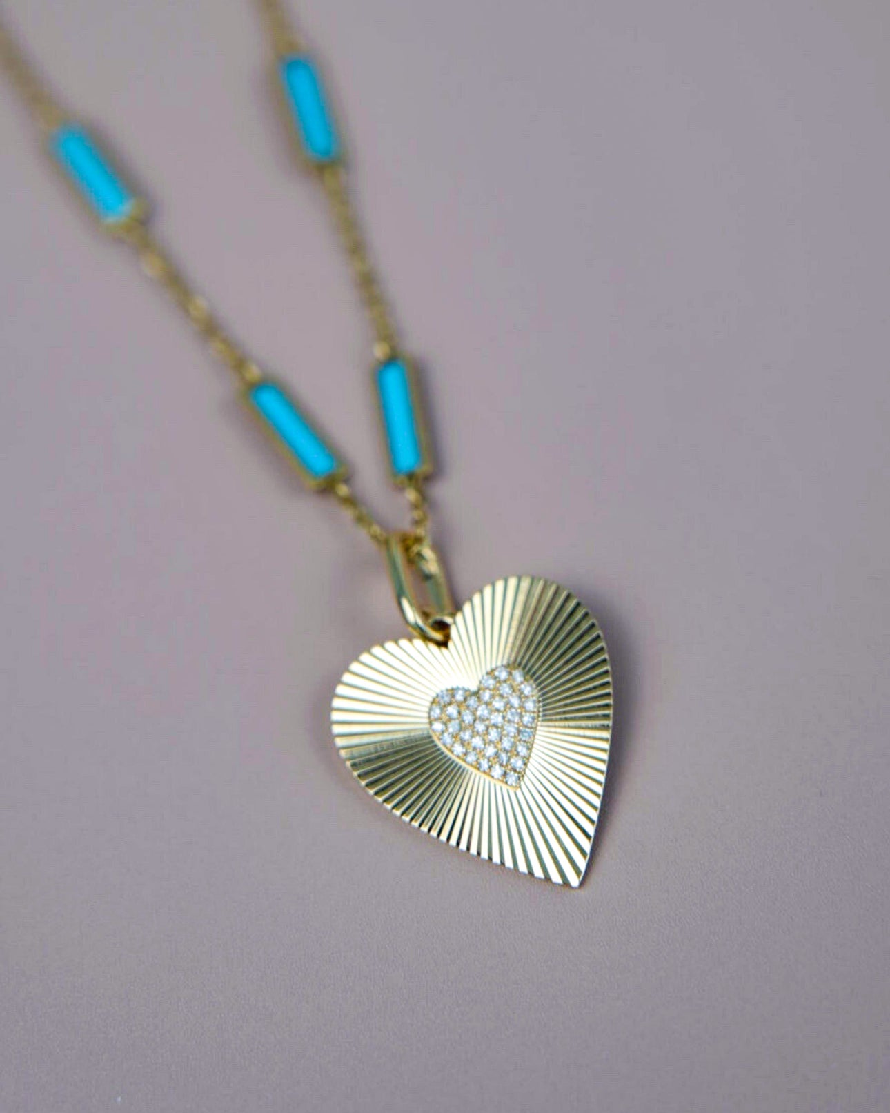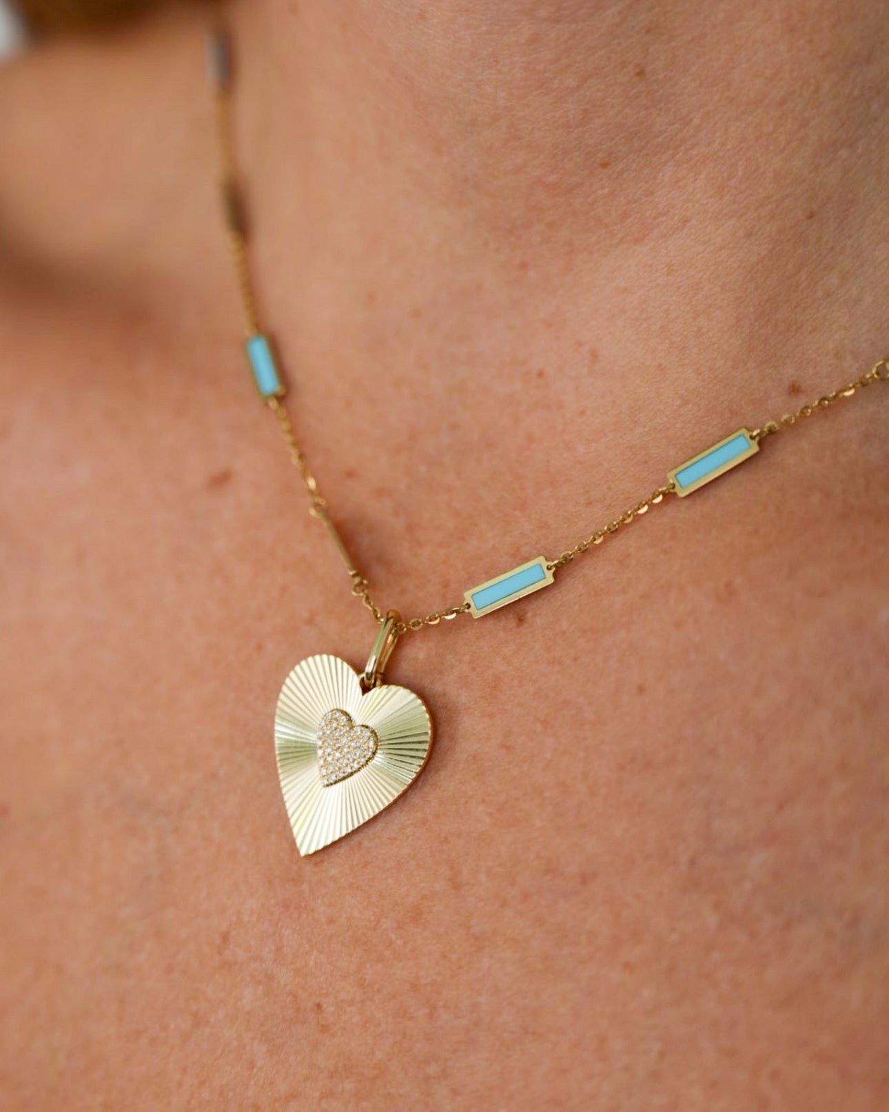 $3,260A delicate 14K yellow gold necklace featuring a modern multi-bar chain design paired with a fluted heart pendant accented with a subtle diamond detail. Soft Turquoise accents along the chain add a feminine touch, creating a piece that feels contemporary.