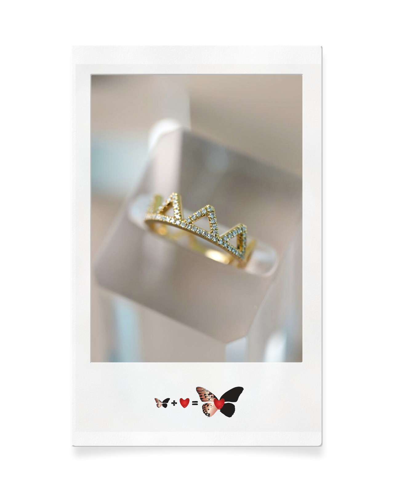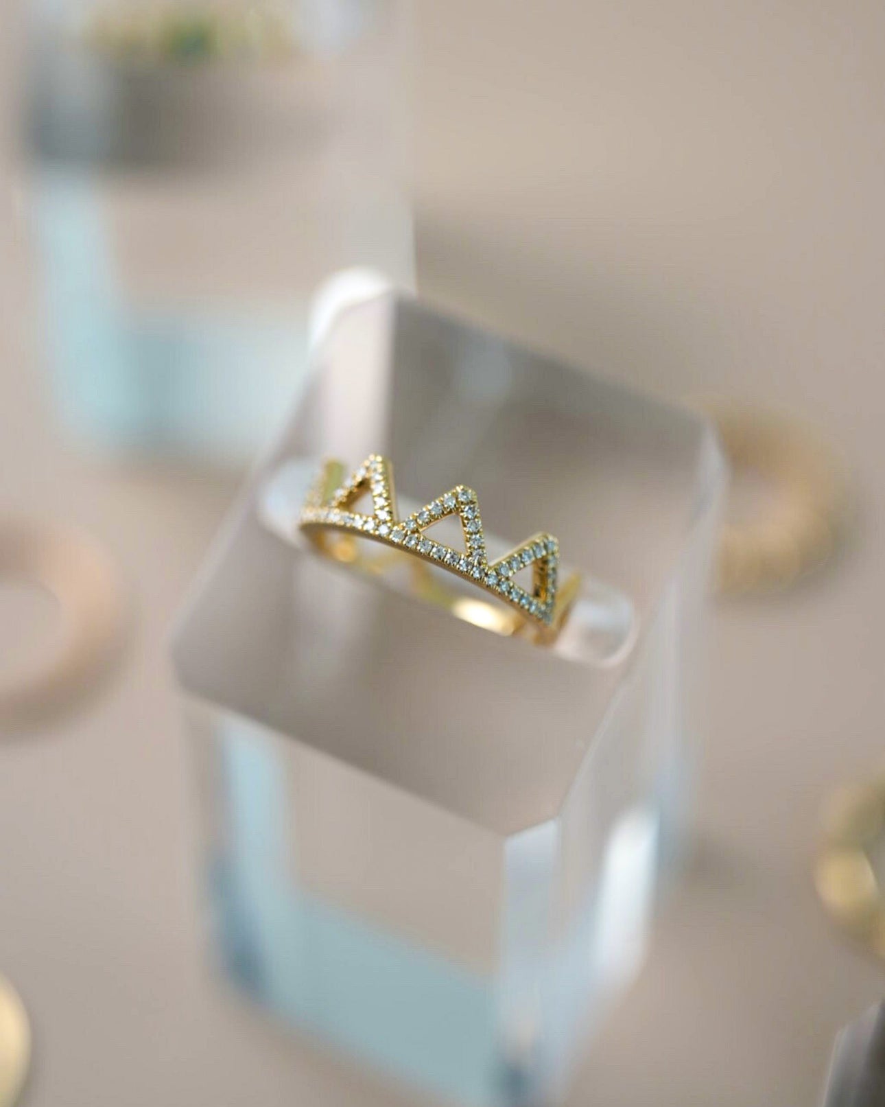 The triangle elements add texture and dimension, creating a statement ring that feels contemporary and fashion-forward while still maintaining timeless elegance.