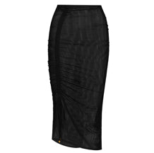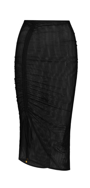 Illusion mesh gathered skirt. Made in a slim fit with gathering along the front for a flattering fit. Double layer mesh fabric with nice stretch and just enough coverage. Adjustable side ties allow you to raise or lower the length. Ties are finished with gold ends for a luxe finish. Designed and produced in New York City.