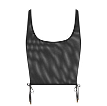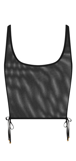 Illusion mesh tank top. Made with a square neck, cropped bodice and double layer mesh fabric with nice stretch. Adjustable side ties allow you to raise or lower the length. Ties are finished with gold ends for a luxe finish. Designed and produced in New York City.