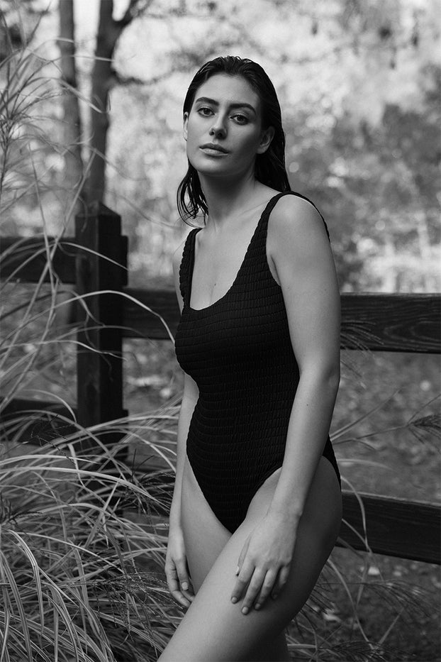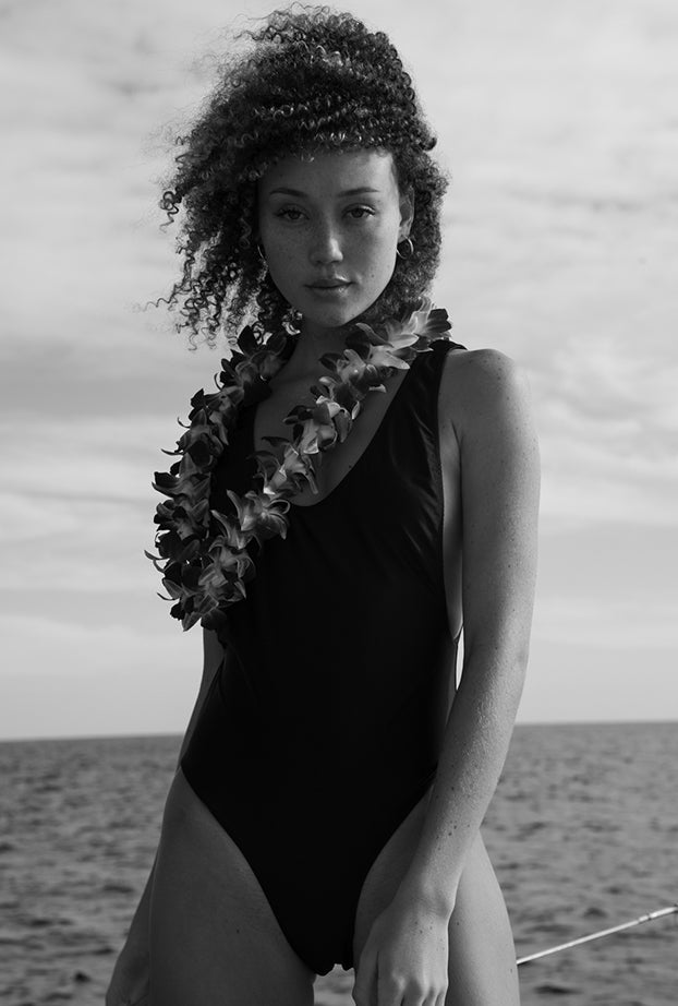 Aura one piece. Made with a square neck, slim fit and low cut back. Available in solid colors and custom embroidered mesh. Designed and produced in New York City.