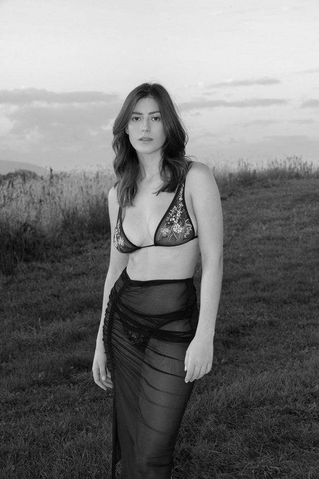 Iris triangle bikini top. Our newest triangle top with adjustable over-the-shoulder straps. Embroidered versions provide full coverage. Gold tie ends for a luxe finish. Designed and produced in New York City.
